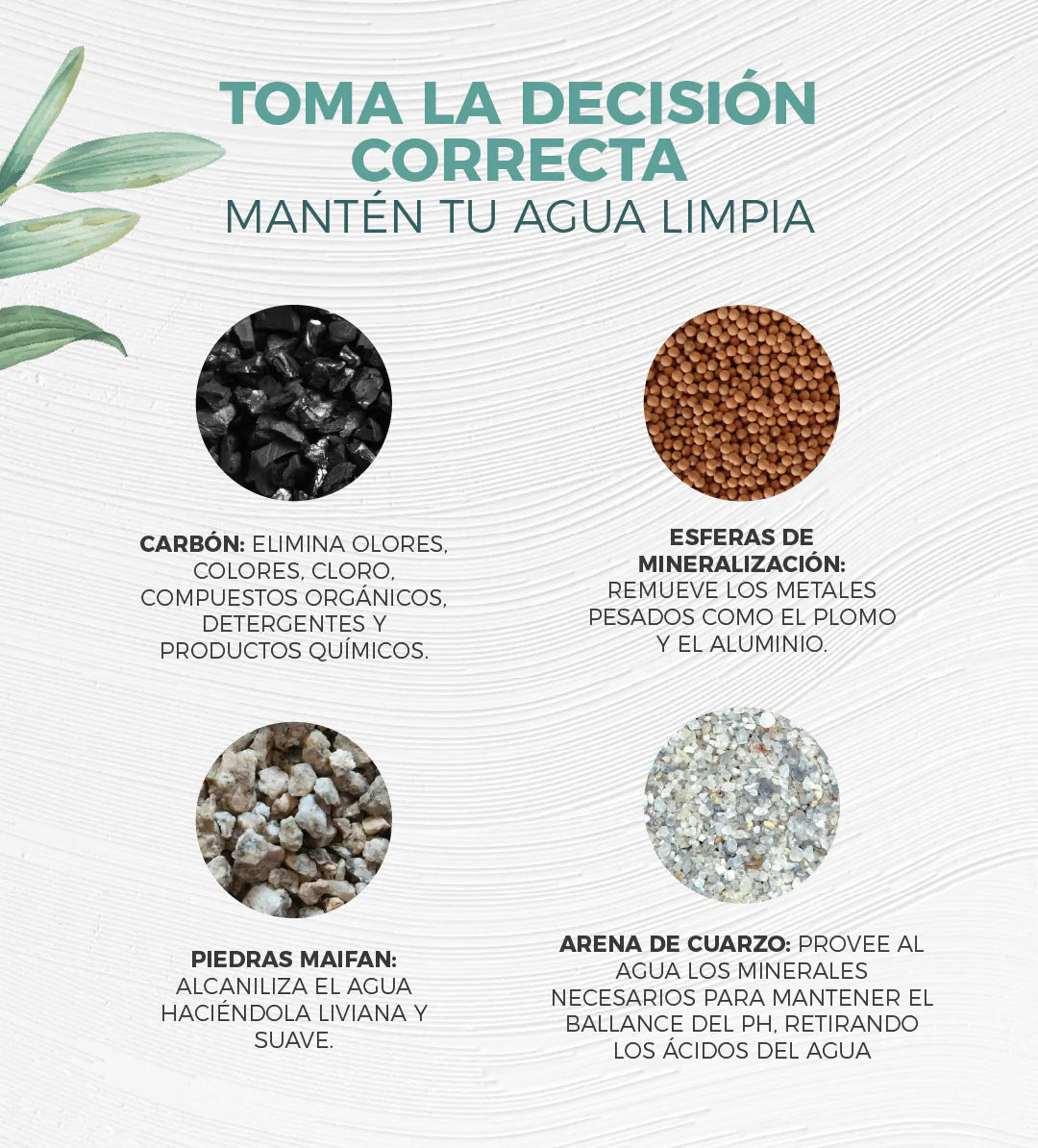 Gracias a su combinación de carbón activado, arena de cuarzo, bolas minerales, piedras medicinales y un cartucho cerámico, el agua que recibes es 100% purificada, limpia y lista para consumir.