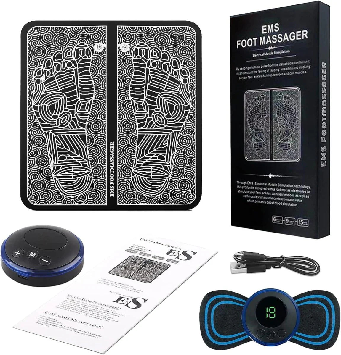 - Tapete Masajeador Eléctrico: estimula directamente los músculos de los pies, tobillos y pantorrillas con pulsos eléctricos de baja frecuencia. Tiene 6 modos de masaje y 9 niveles de intensidad, que imitan técnicas como acupuntura, amasado, raspado y ventosas. Perfecto para aliviar hinchazón, fatiga y mejorar la circulación.